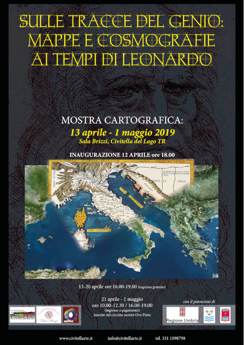 Da sabato 13 aprile a mercoledì 1 maggio 2019 presso la Sala Brizzi a Civitella del Lago (TR) mostra “Sulle tracce del genio: mappe e cosmografie ai tempi di Leonardo” a cura dell’Associazione Culturale CivitellArte in collaborazione con l’Associazione Roberto Almagià – collezionisti italiani di cartografia antica, l’Associazione Culturale Ovo Pinto e con il patrocinio della Regione Umbria, Provincia di Terni e Comune di Baschi.