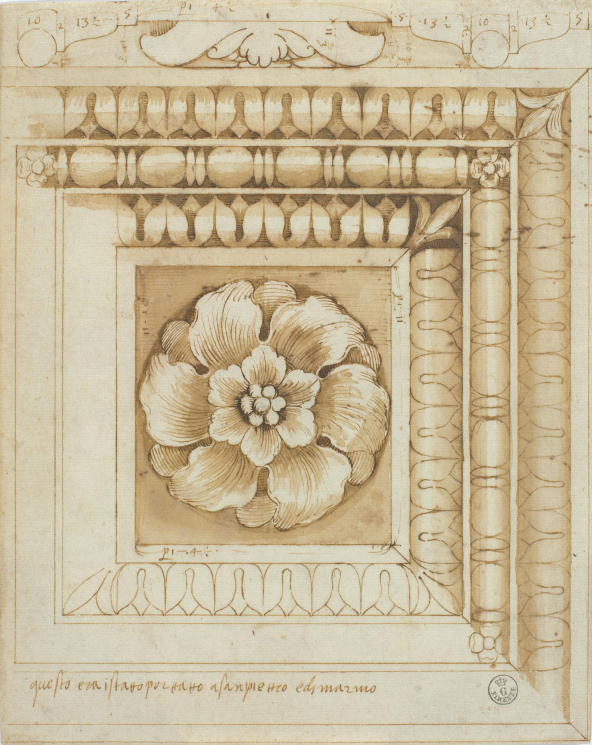 Da una parte il tondo con l’Angelo inginocchiato su un pavimento in